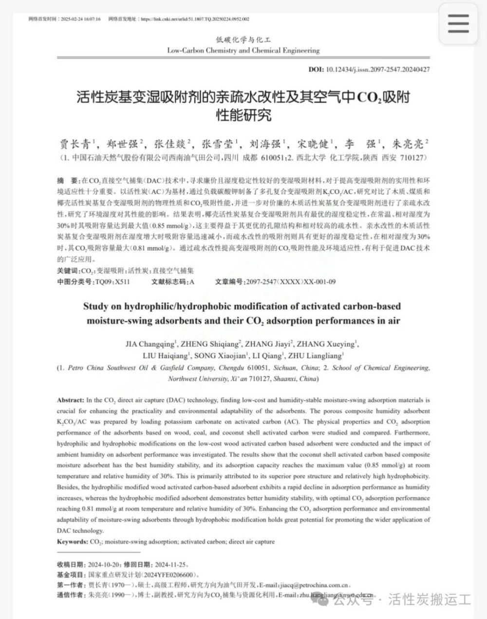 活性炭基变湿吸附剂的亲疏水改性及其CO₂吸附性能的研究