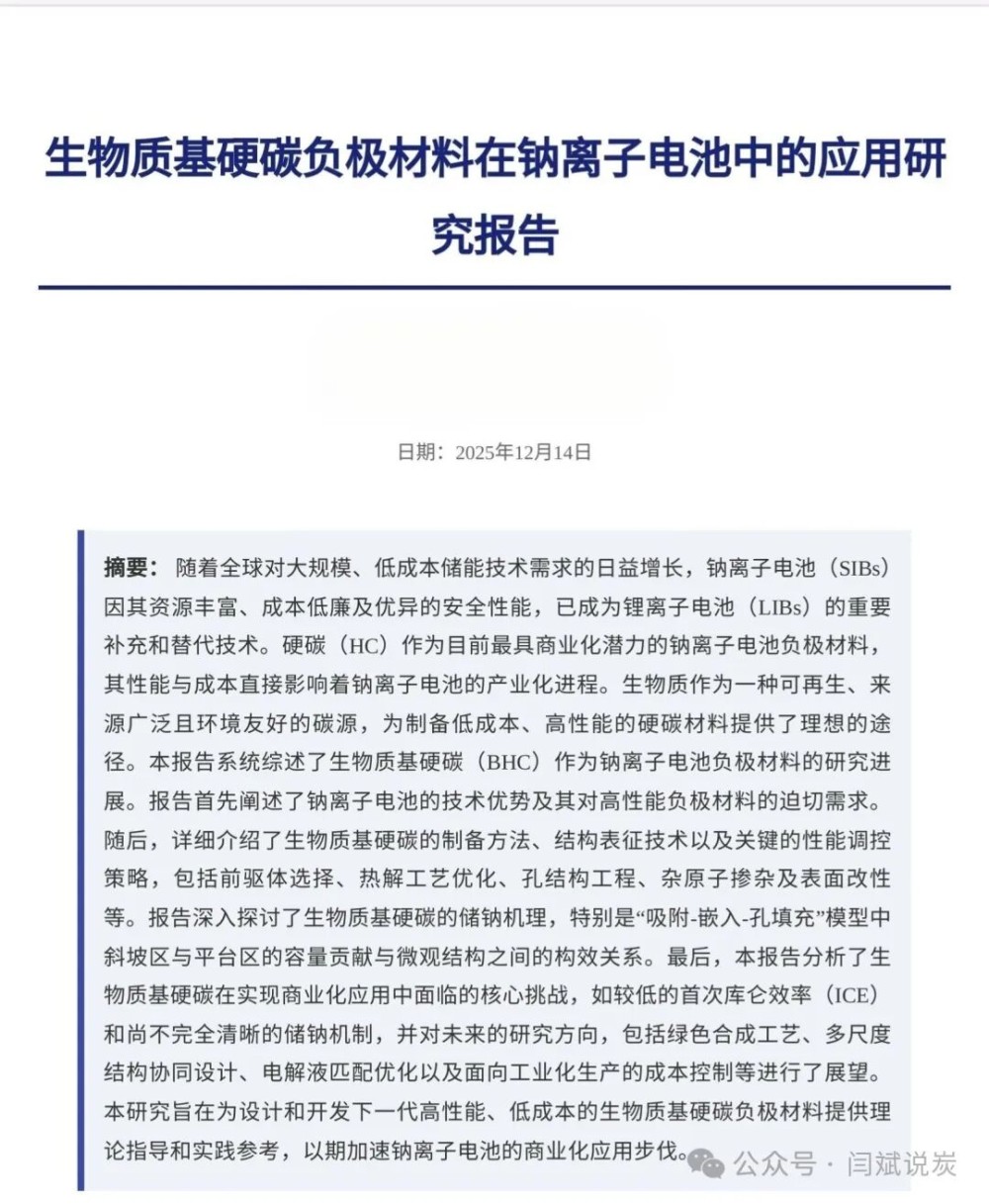 生物质基硬碳负极材料在钠离子电池中的应用研究报告