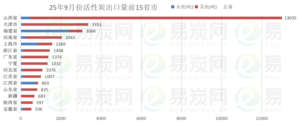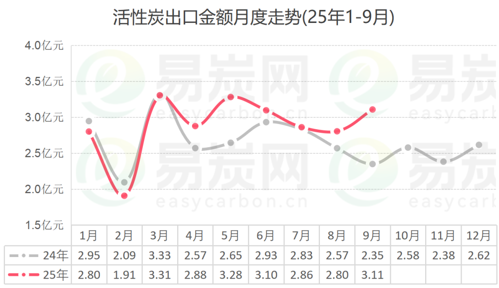 据海关数据统计显示,中国活性炭出口数量方面,9月中国活性炭出口量为 3.4 万吨,同比增加 35.9%,环比增加 7.8%;出口金额方面,9月份出口金额 3.11 亿元,同比去年同期增加 32.4%;出口均价 9153 元/吨,同比去年减少 2.5%。